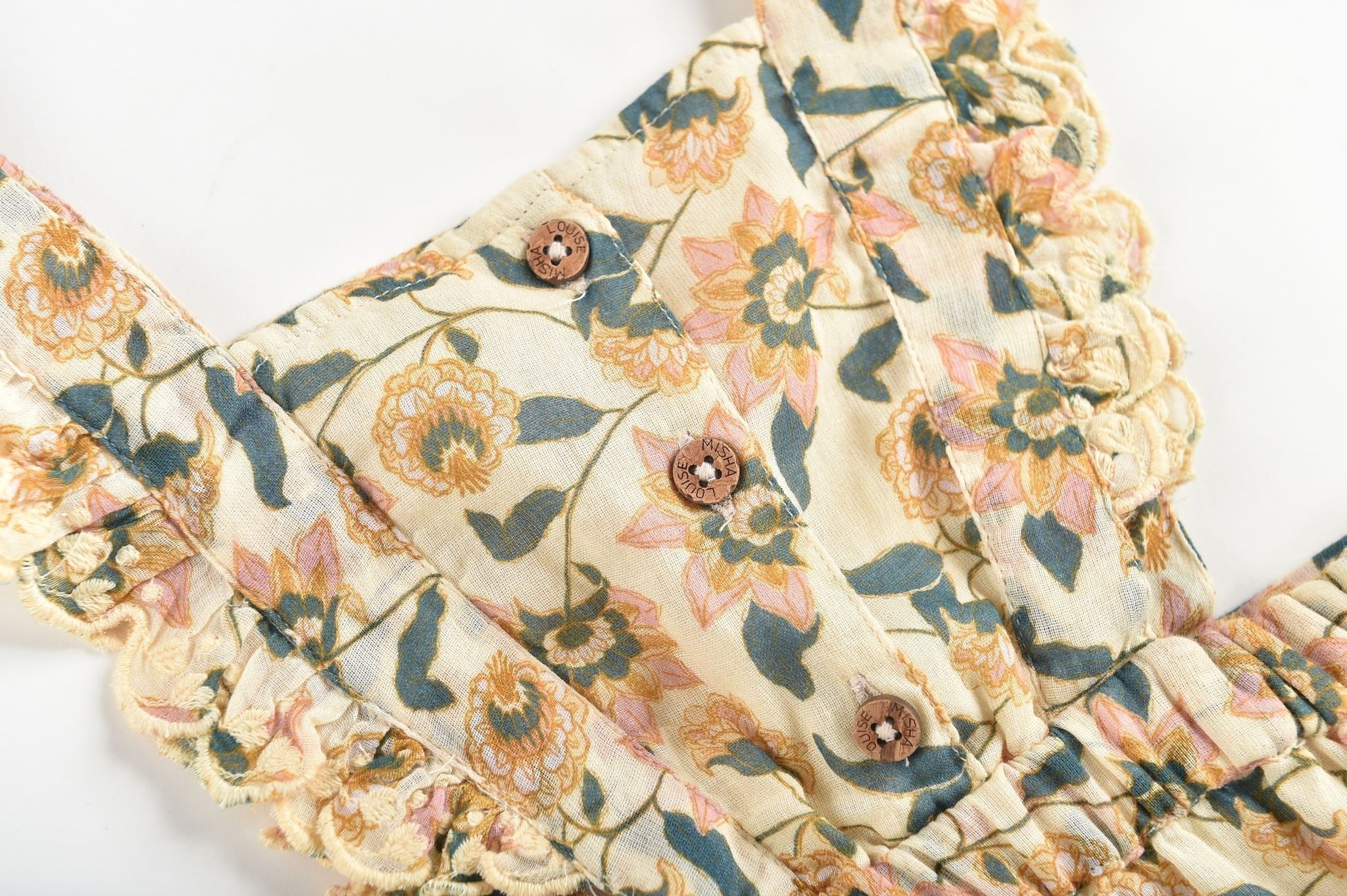 Платье-фартук без рукавов из 100% органического хлопка с милым цветочным принтом. Бретельки с оборками, накладные карманы, эластичные бока, застежка на пуговицы сзади. Это платье небольшого размера, советуем брать на размер больше обычного.Производство: ИНДИЯ