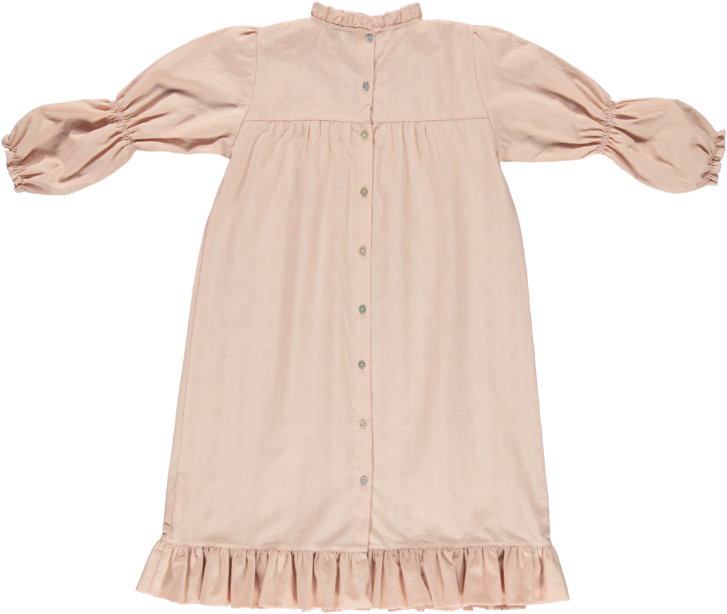 Прекрасное  платье  из органического хлопка, нежно розового цвета с едва заметным тиснением на ткани. Длинные рукава, отделка на горловине элегантным бантиком в английском стиле.