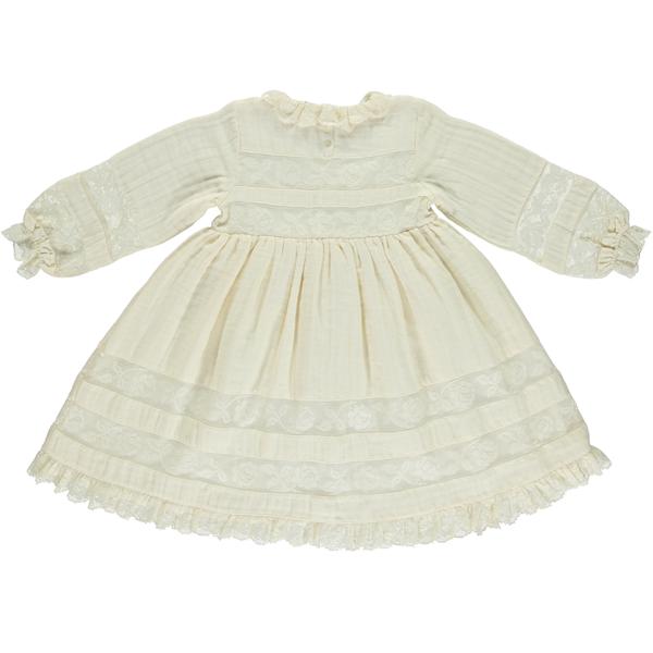 Традиционное платье изготовлено из мягкого двойного муслина и органического хлопка с красивым винтажным кружевом в виде роз, украшающим кромку, рукава и грудь. Прекрасный выбор для любого мероприятия. Изысканный силуэт с длинным рукавом с кружевными деталями и нежной оборкой воротника кружевом.Производство: ПОРТУГАЛИЯ