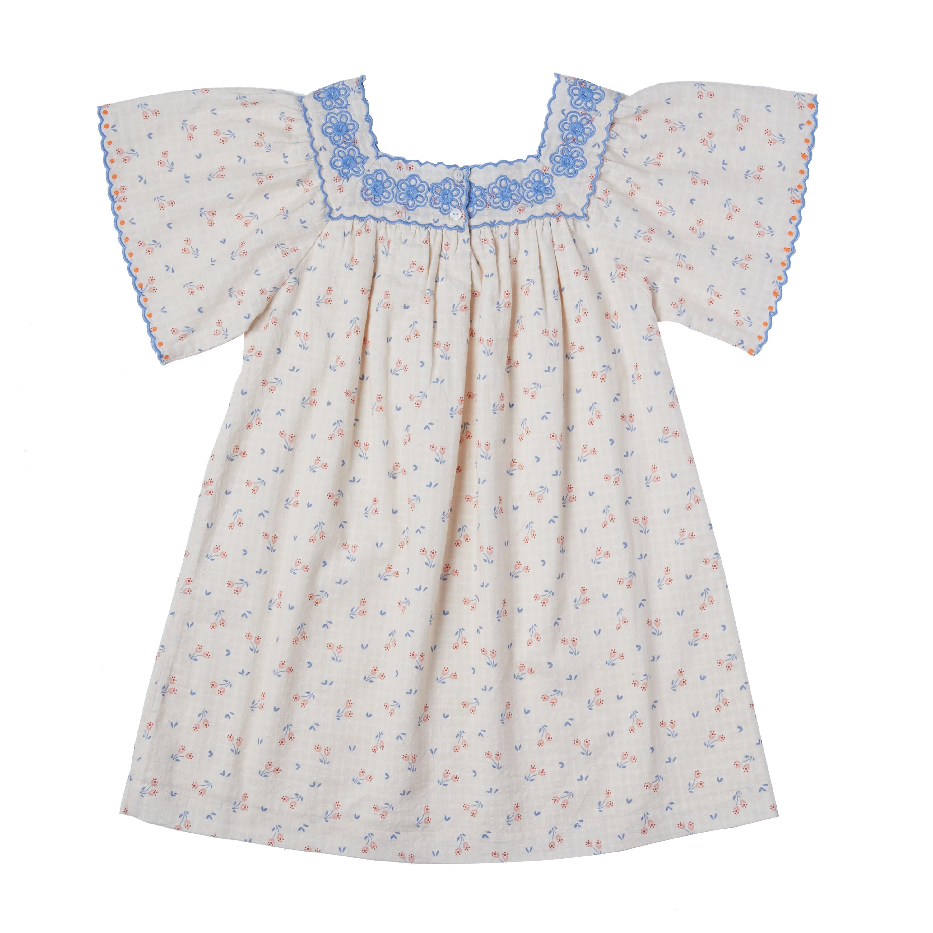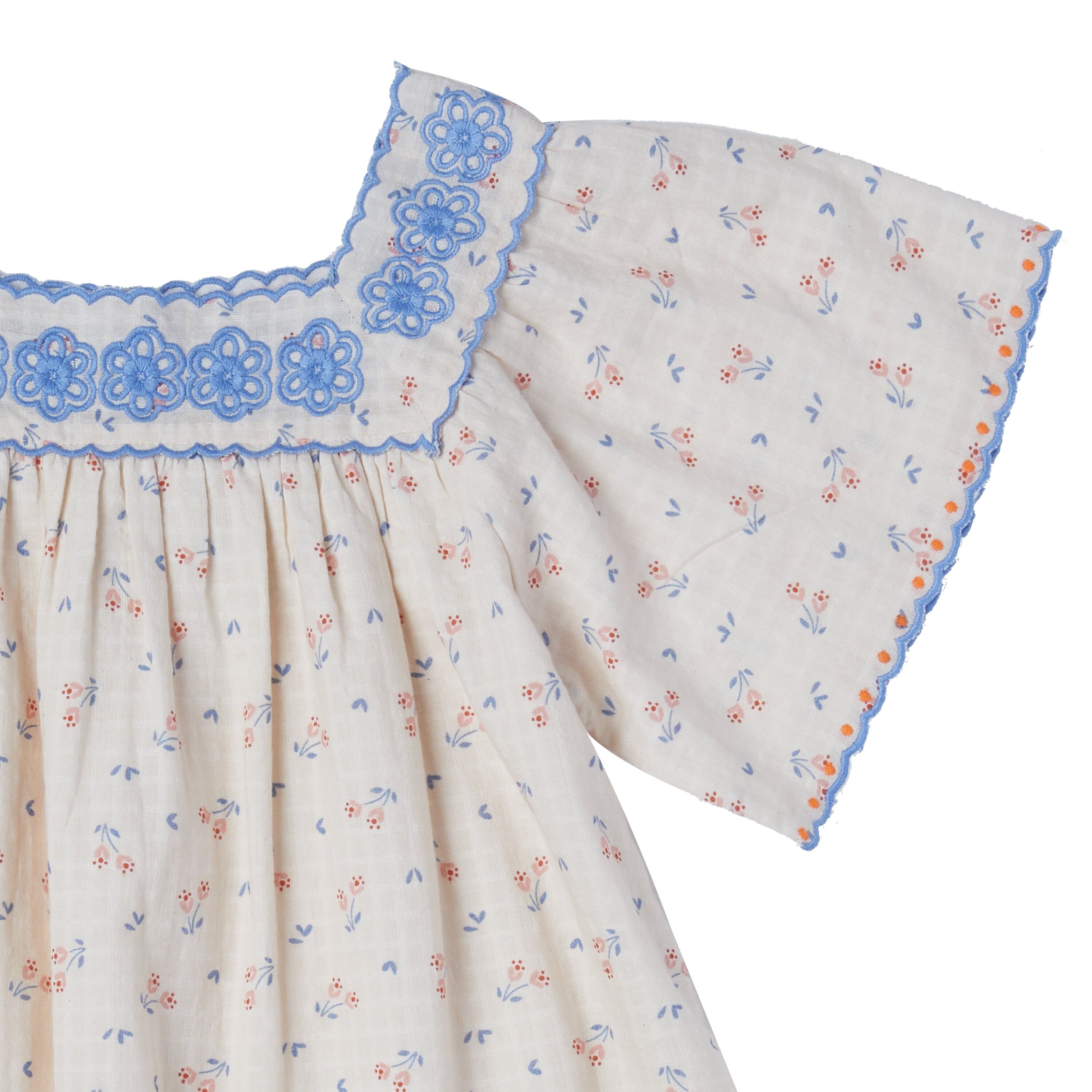 Нежное платье с цветочным принтом на светлом фоне. Украшено вышивкой - голубые цветы. Свободный крой, чтобы комфортно себя чувствовать в летний день. Производство: ИНДИЯ