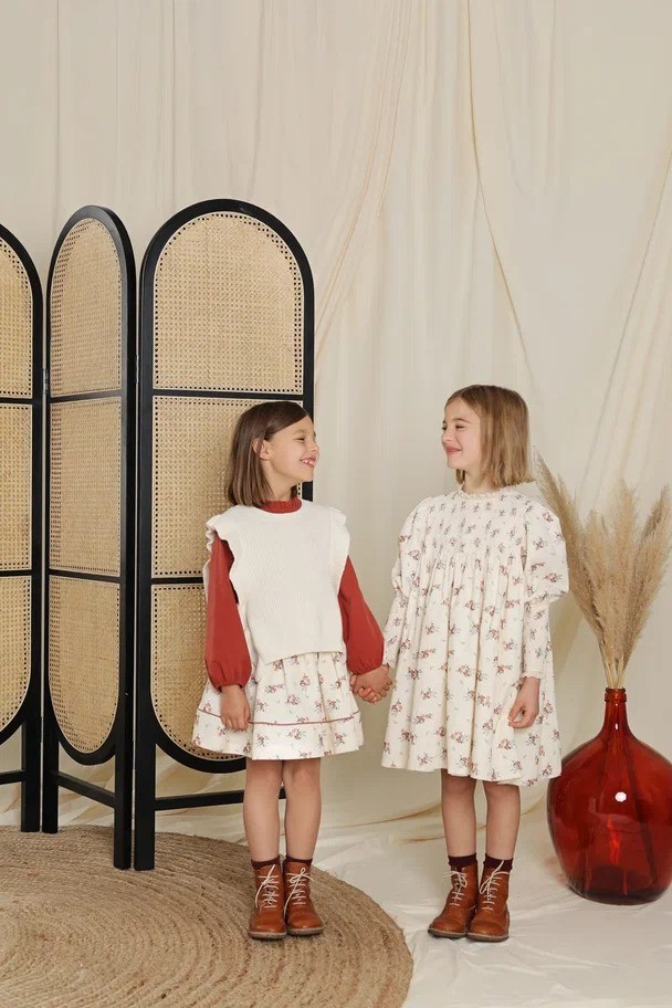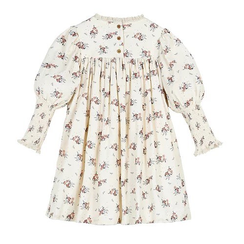 Нарядное платье с цветочным принтом на фоне благородного экрю, зауженные рукава придают модели аутентичность, длина по колено, удобное и комфортное оно станет любимым в гардеробе Вашей дочери.