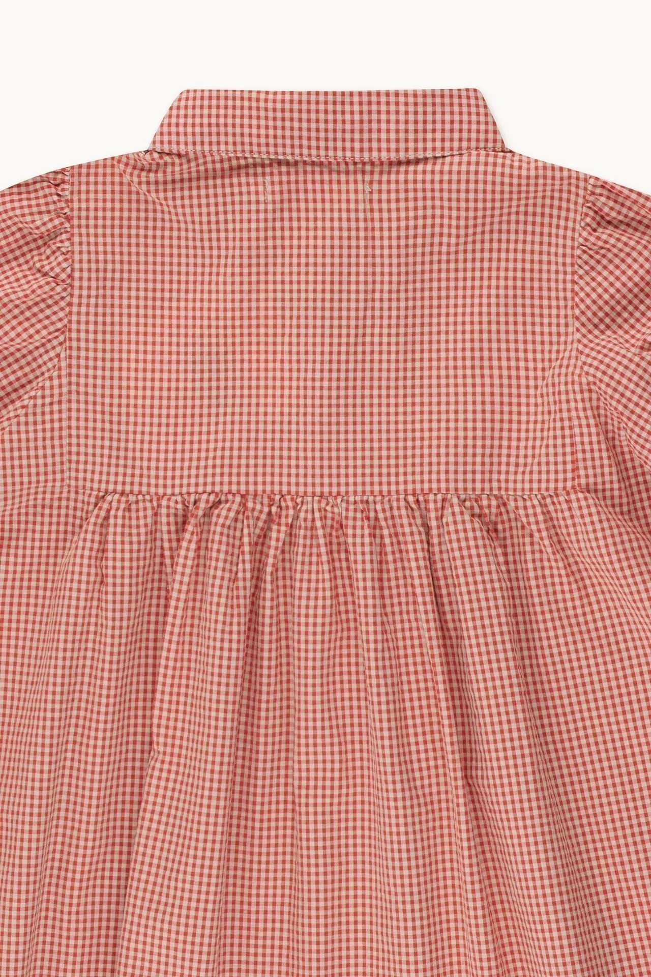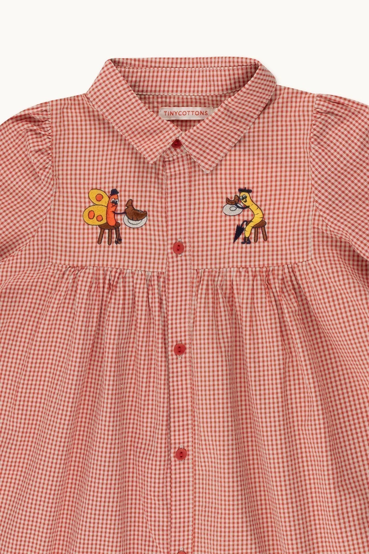 Платье в клетку с забавной вышивкой с воротником-стойкой, застегивается спереди на пуговицы сверху до низу, легкая сборка в верхней части модели, эластичный край рукава.