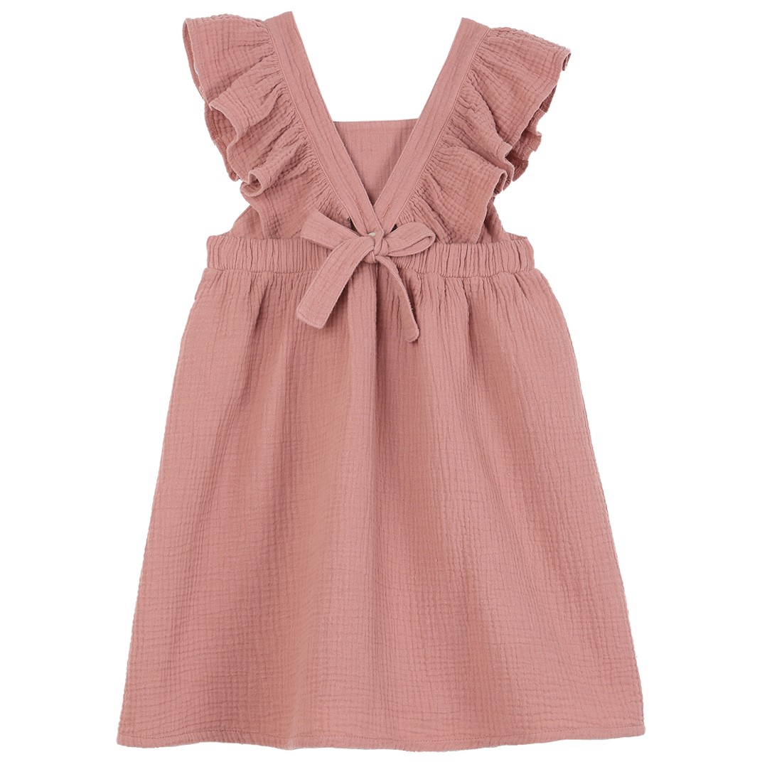 Платье-фартук из темно-розовой двойной хлопковой жатой фактурной ткани. Бант сзади, оборчатые бретели, которые регулируются с помощью пуговицы и окаймляют нагрудник, присборенная передняя юбка и 2 прорезанных и прошитых кармана.Производство: ПОРТУГАЛИЯ