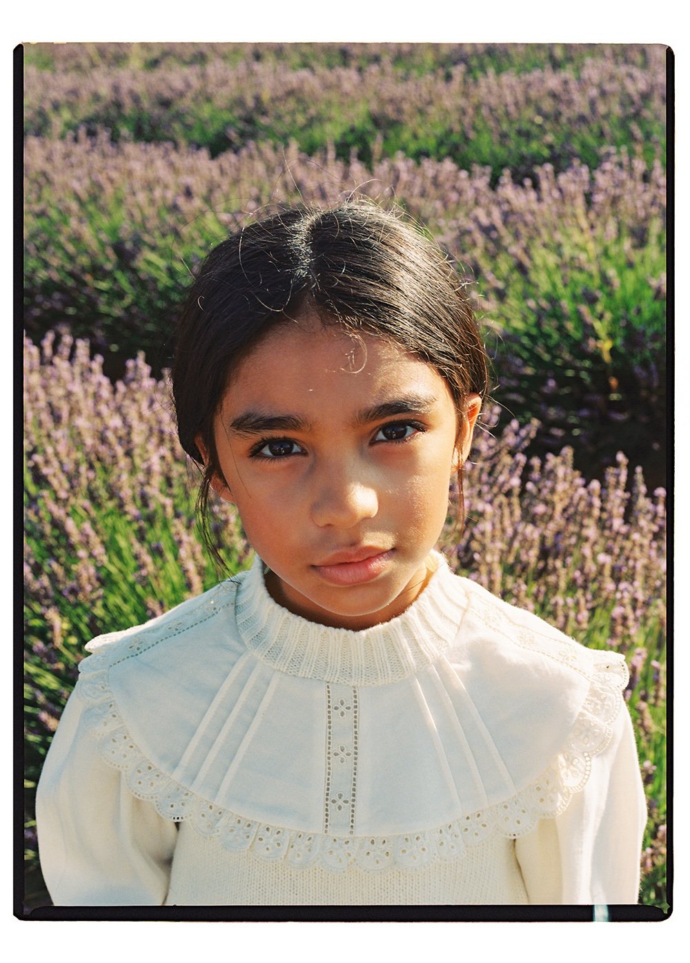 Вязаный джемпер с круглой кокеткой-воротником, декорированной натуральным хлопком с английской вышивкой. Романтичная модель для юных леди.Производство: ПОРТУГАЛИЯ