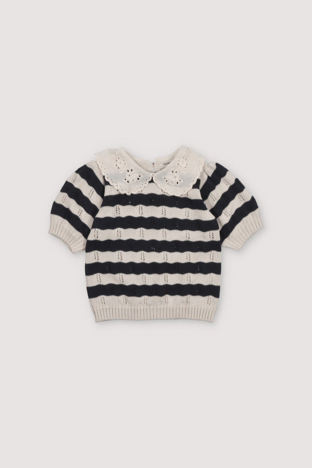 Этот вязаный свитер в двухцветную полоску с короткими рукавами создан в морском стиле. Изящный кружевной воротник контрастного цвета придает изделию очаровательный вид. Идеально подходит для создания веселого и стильного образа в сочетании с брюками в тон.Производство: ПОРТУГАЛИЯ