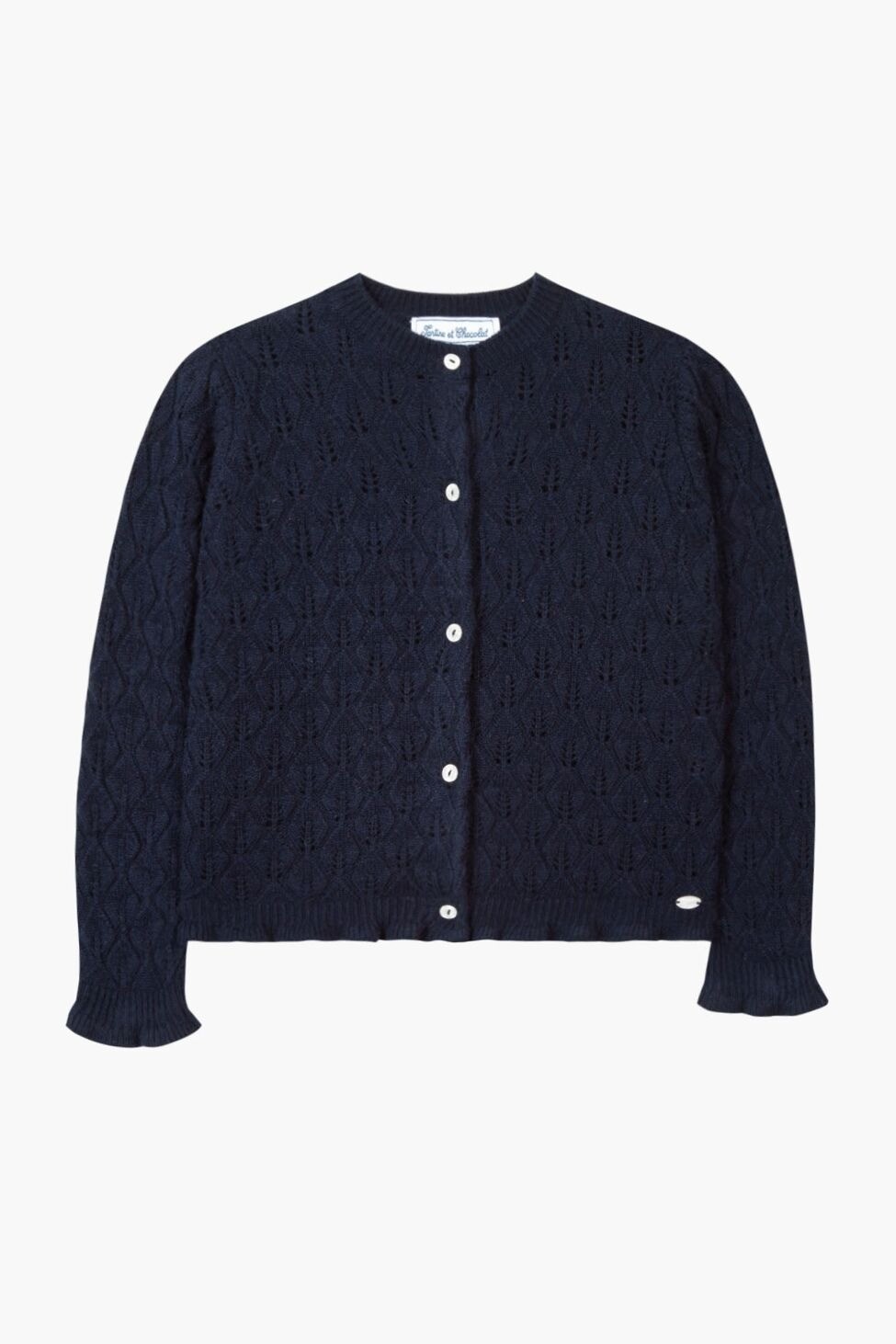 Кардиган темно-синего цвета из ажурного трикотажа станет неотъемлемой частью нарядов Вашей малышки. Ажурный трикотаж в форме маленьких листочков, который напоминает нам об осени. Изящные пуговицы с перламутровым эффектом и рукава в рубчик придают ему элегантный и яркий вид. Идеально подходит для повседневной носки в сочетании с брюками.Уход: Стирать при температуре 30 градусов, не сушить и не отжимать в стиральной машине.