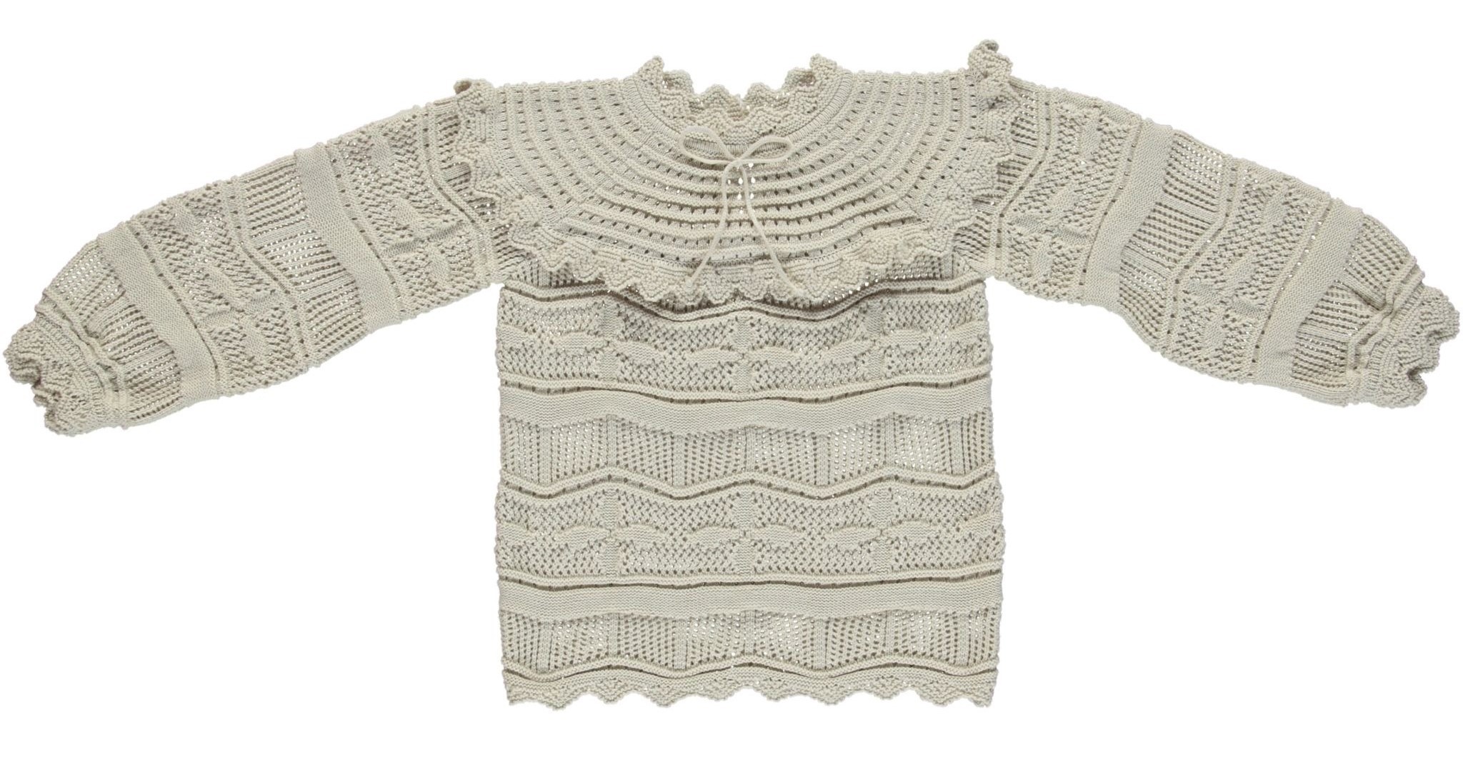Вязаный ажурный пуловер в романтическом стиле chroche с очаровательными цветочными деталями. Изготовлен из мягкого натурального хлопка. Длинные пышные рукава с двойной отделкой из кружева, элегантный высокий кружевной воротник с оборкой и бантом спереди.Производство: ПОРТУГАЛИЯ