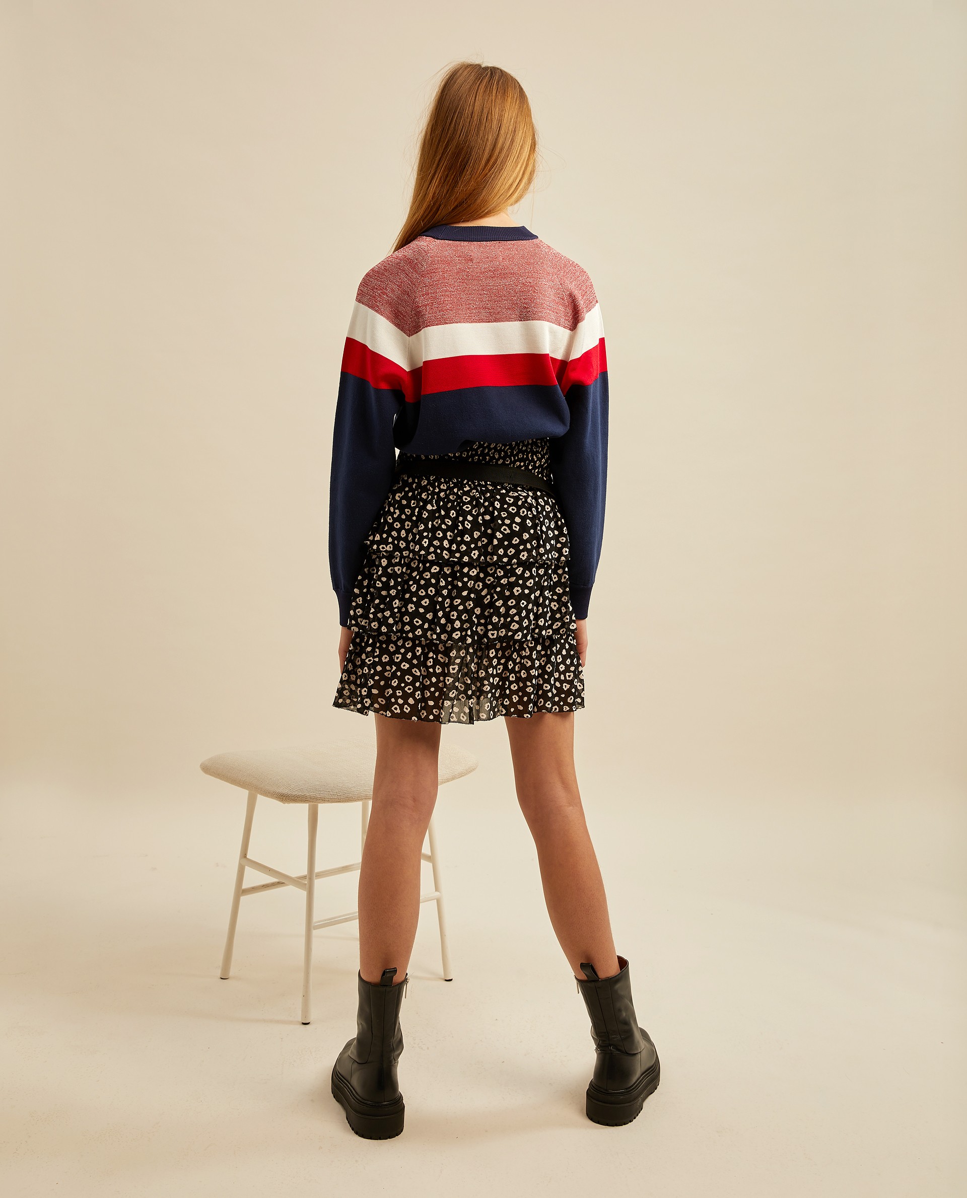Эффектный пуловер, привлекающий внимание верхней частью с люрексом и контрастными полосами бело-красного цветов.