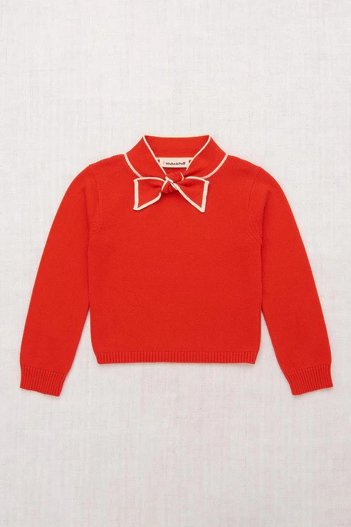 Милый свитер из тонкого трикотажа Pima из хлопка, с воротником на вырезе, завязанным спереди бантом с белой отделкой, манжетами и подолом в рубчик. Его можно носить как в холодное, так и в теплое время года.Производство: ПЕРУ