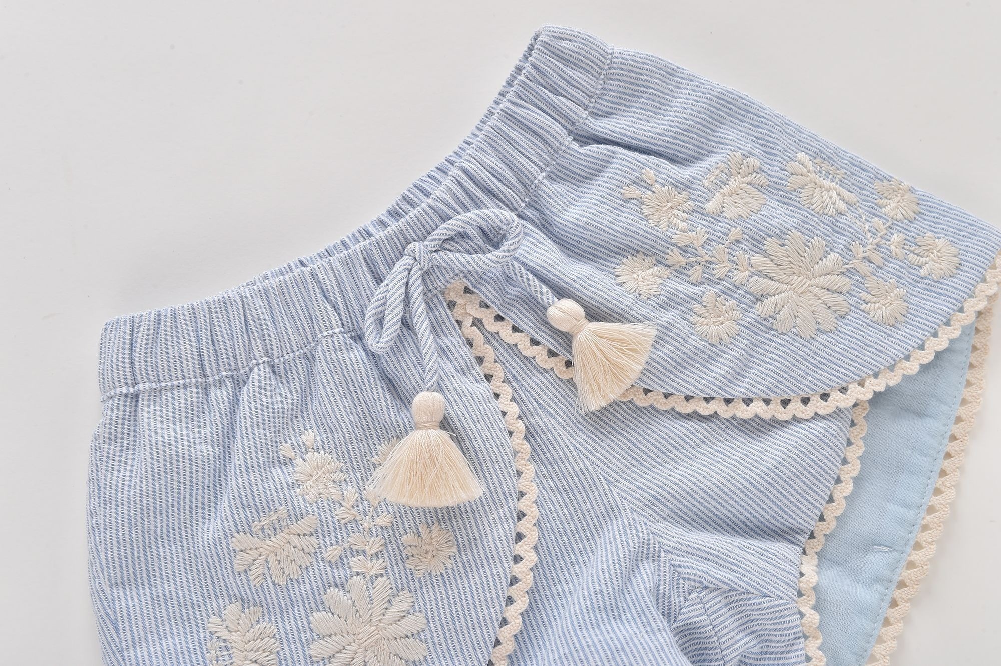 Новая элегантная модель шорт из хлопка с драпированными вставками спереди для очаровательного эффекта и неповторимого стиля. Вышитые винтажными цветами, они смотрятся великолепно. Эластичная талия, декоративный бант с помпонами ручной работы, драпировка спереди, цветочная вышивка в винтажном стиле, ажурные кружевные вставки по краям, полностью на подкладке.Производство: КИТАЙ