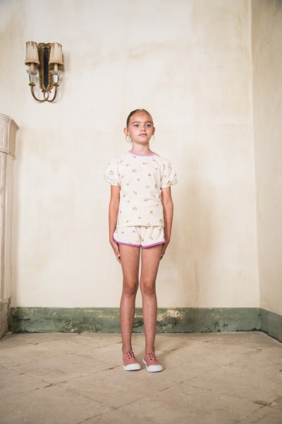 Укороченные шорты из тонкой махровой ткани с нежным цветочным принтом обязательно понравятся Вашей юной моднице. Цветовая гамма модели предполагает множество вариантов верха от однотонного нежного, до контрастного яркого. Сияйте этим летом.