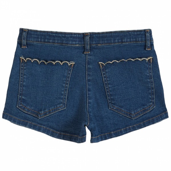 Шорты из эластичного хлопкового денима. Наклонные и зубчатые отверстия по краю итальянских карманов, тканевые пуговицы вытачки сзади и два накладных кармана с фестонами и окантовкой из золотой люрексовой нити подчеркивают силуэт.Производство: ИНДИЯ