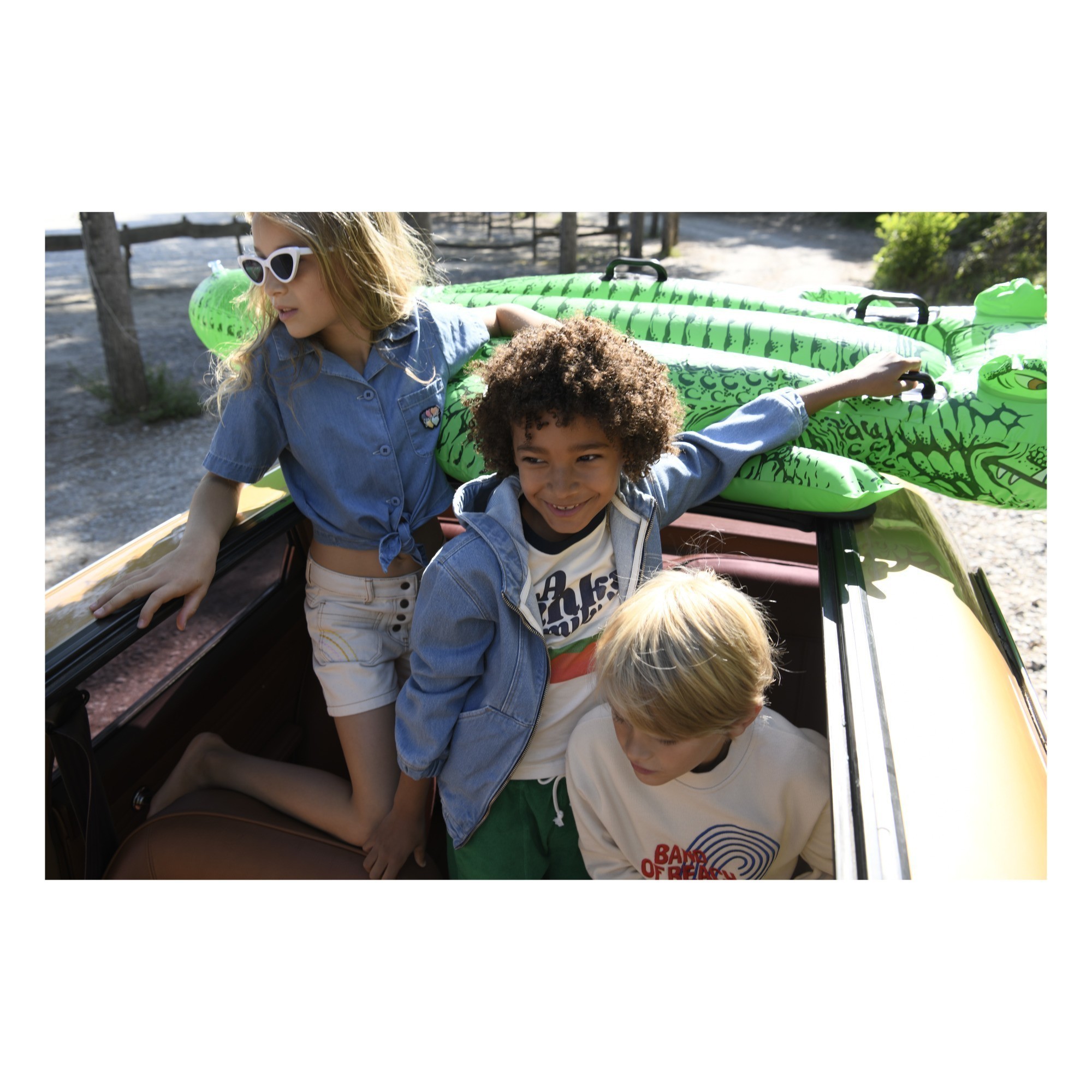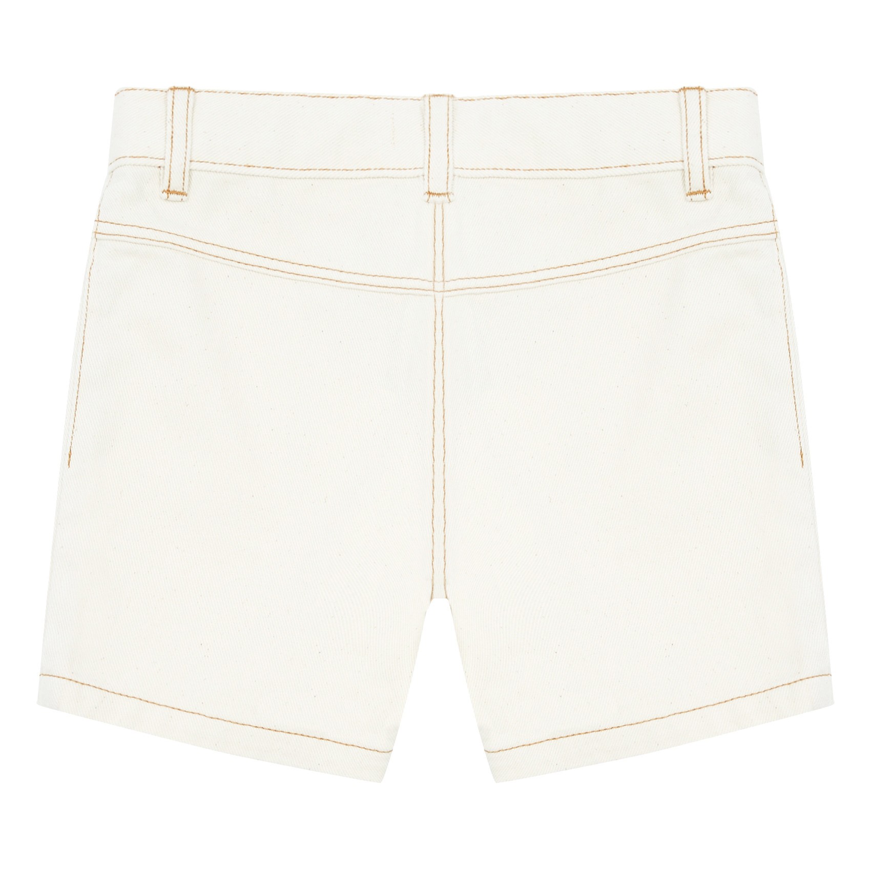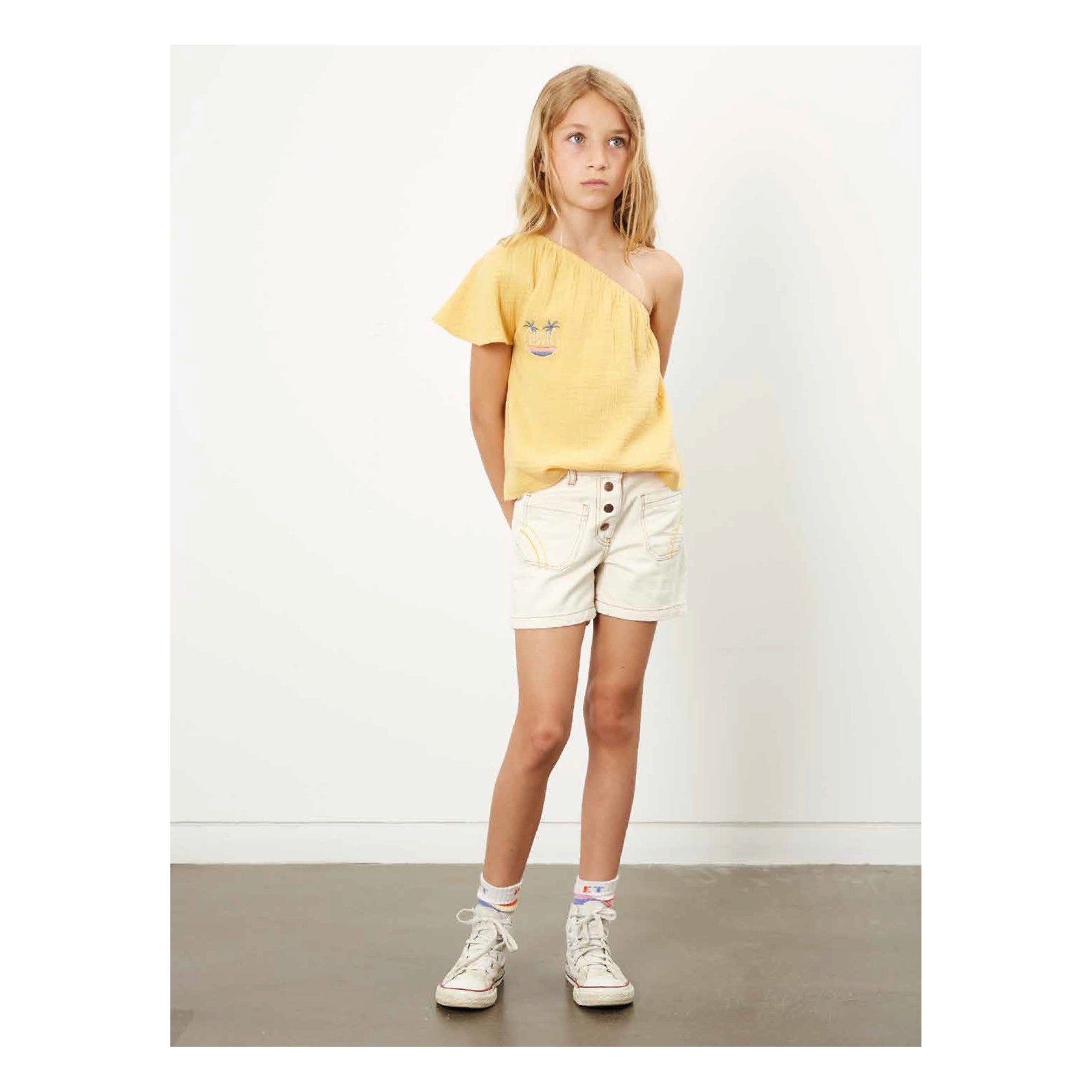 Стильные шорты из денима цвета экрю. Внутренняя резинка на поясе позволяет регулировать объем.Спереди накладные кармашки с вышивкой и матовые металлические кнопки делают модель необычной и интересной.Цветовых решений для верха огромное количество.