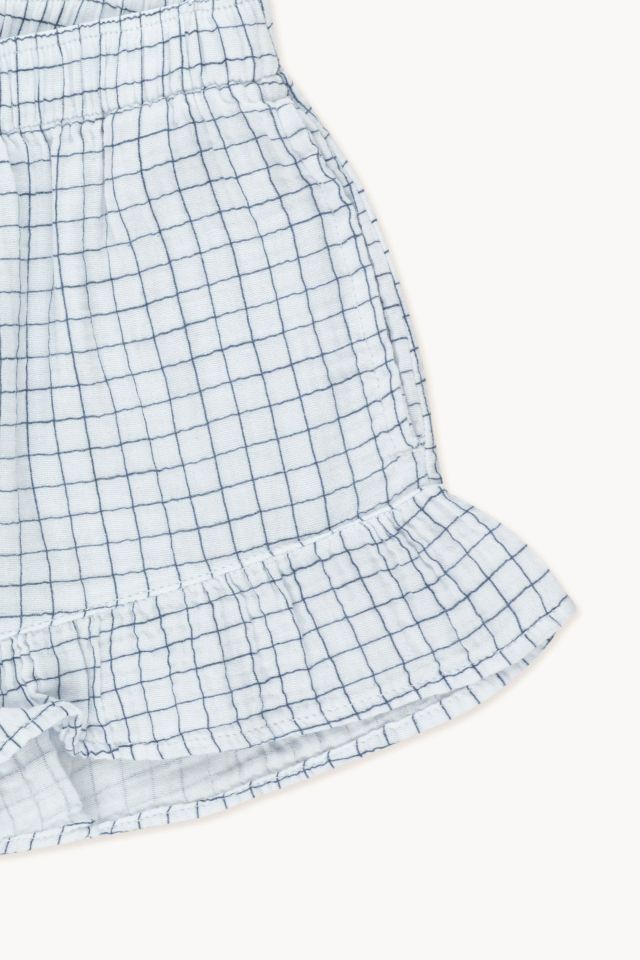 Очаровательные шорты для жарких летних деньков, приятная расцветка, гармонирующая с небом и морем, эластичный пояс, оборки по низу изделия, боковые карманы.