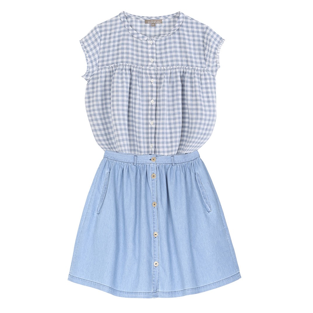Стильная юбка из легкого голубого денима в складку. Спереди застежка на красивые золотые пуговички, внутри резинка  для регулировки объема.Боковые прорезные кармашки по бокам.