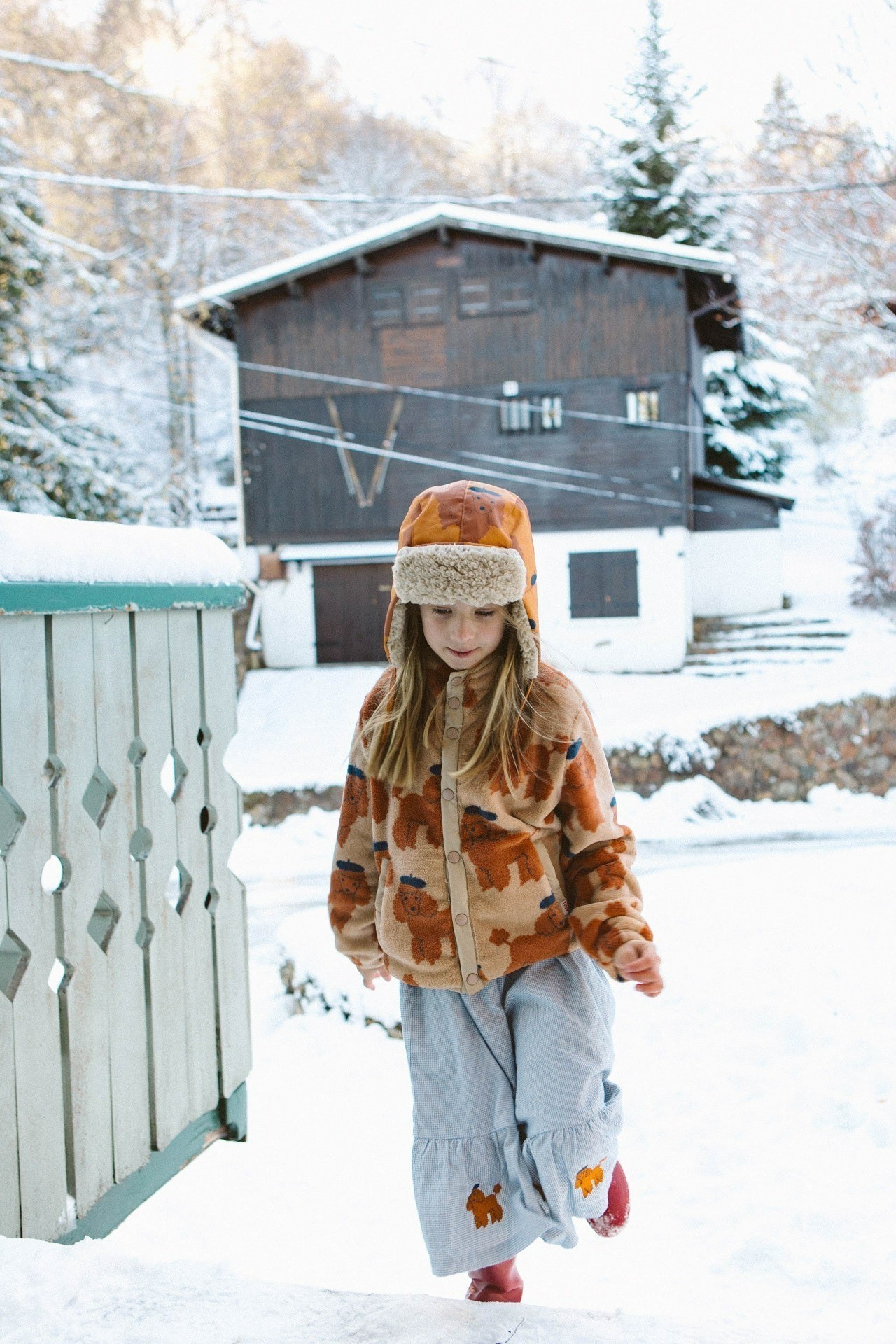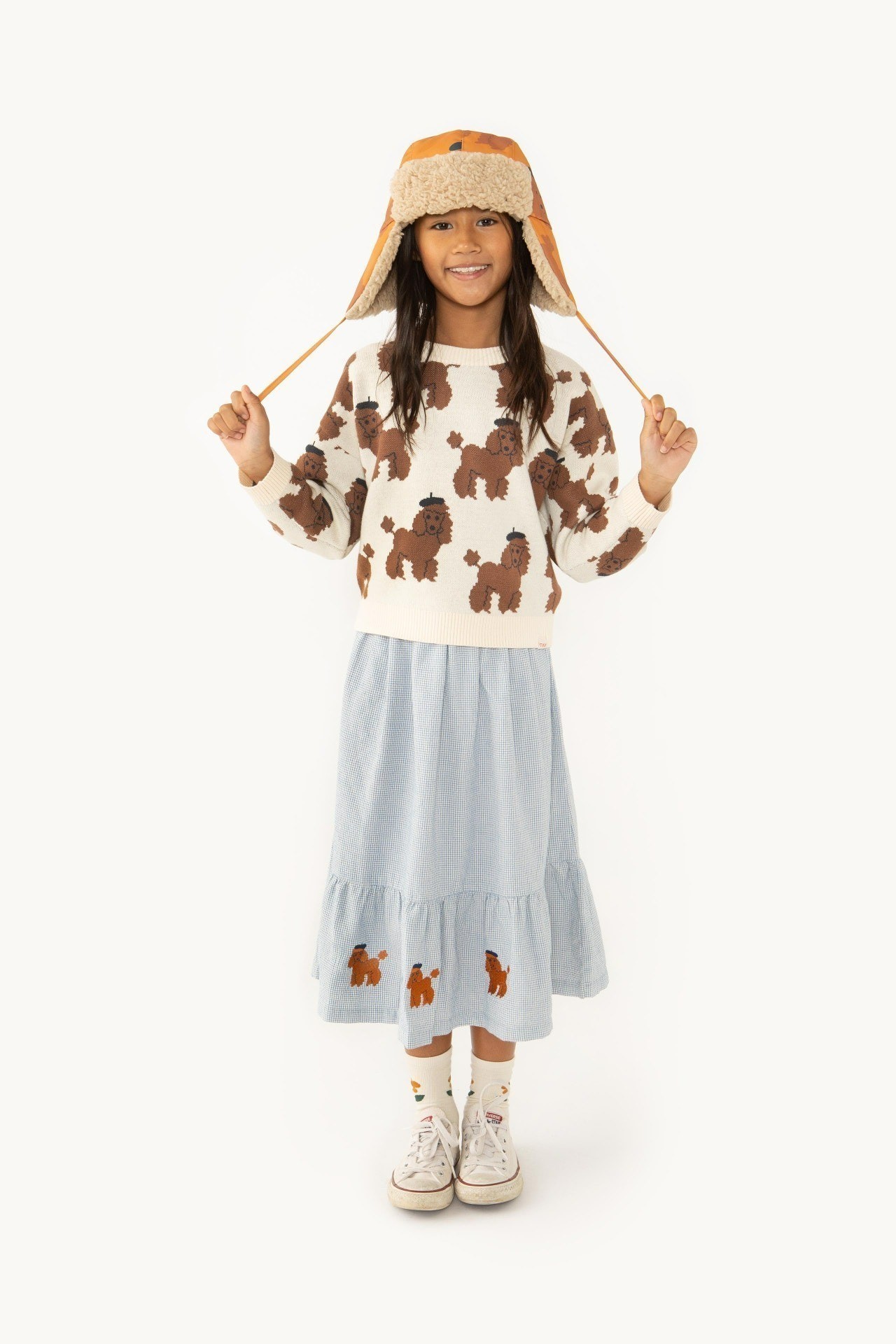 Юбка из текстурированного хлопка в голубую мелкую клетку, с эластичным поясом и оборкой по низу, украшена вышивкой в виде пуделя.Уход: стирать при 30С, не отбеливать, не сушить в стиральной машине, гладить с изнаночной стороны, стирать с аналогичными цветами.