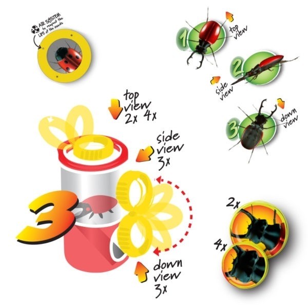 Состоит из двух частей: верх с крышкой снимается отдельно, низ с зеркалом. Линзы: в крышке большая 45 мм и малая 32 мм увеличивают в 2 и 4 раза соответственно, боковая в 3 раза. Пинцет и букашка в комплекте. На дне шкала для измерения размеров. В крышке отверстие для воздухообмена.ВНИМАНИЕ: Никогда не смотрите на солнце - это может вызвать повреждение глаз!Возраст: от 3-х лет.