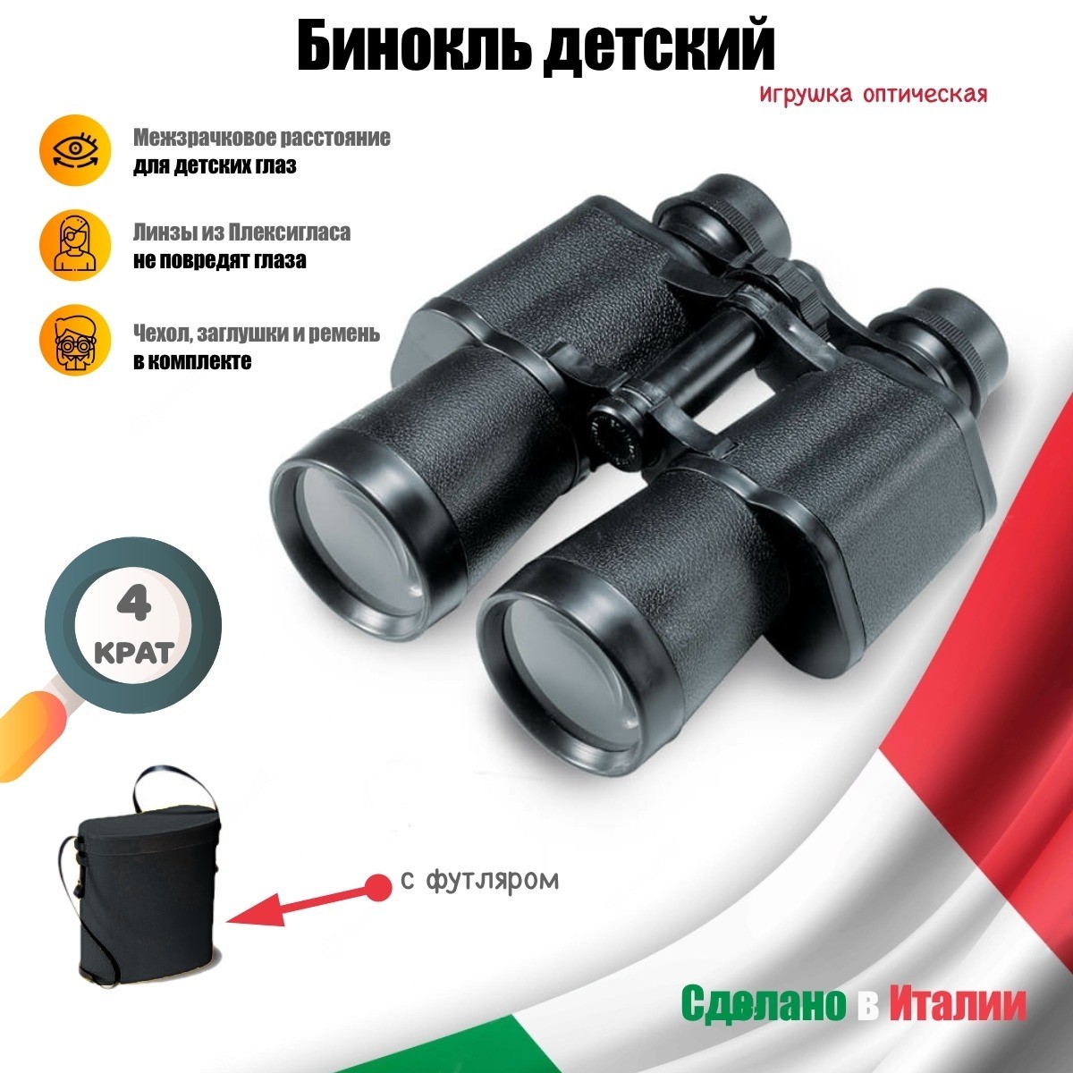 Увеличение в 4 раза, регулировка фокуса и межзрачкового интервала 49-76 мм. Диаметр объектива 50 мм. Оптика - 4 элемента. Ремешок для ношения, заглушки на окуляры.ВНИМАНИЕ: никогда не смотрите на солнце - это может вызвать повреждение глаз!Возраст: от 3-х лет.Производство: ИТАЛИЯ