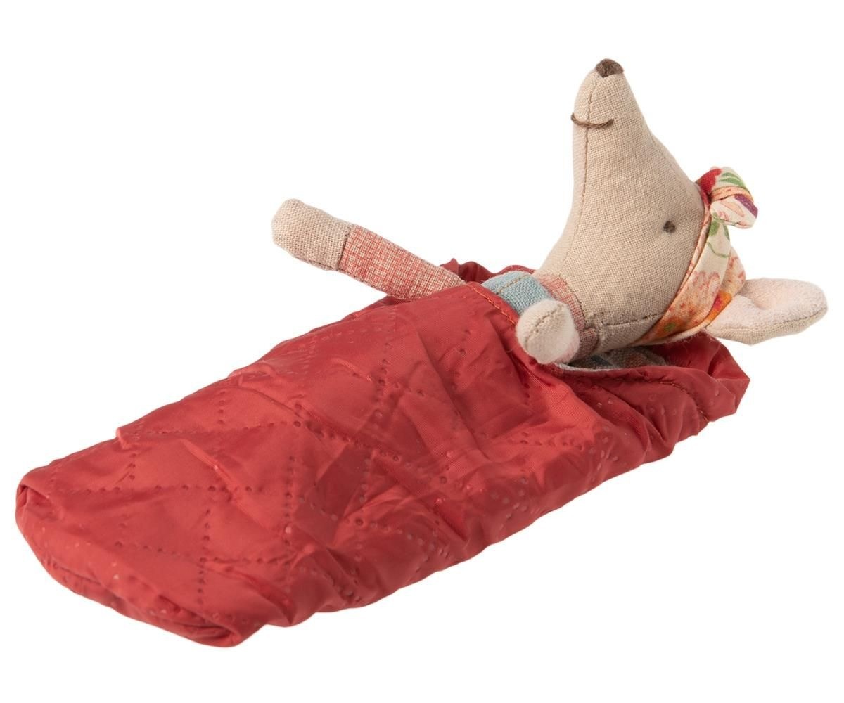 Мышка в модном джинсовом сарафане и бандане собралась в путешествие. С собой у нее есть спальный мешок для ночевки на природе. Если она попадет под дождь, не беда, все вещи легко стираются.