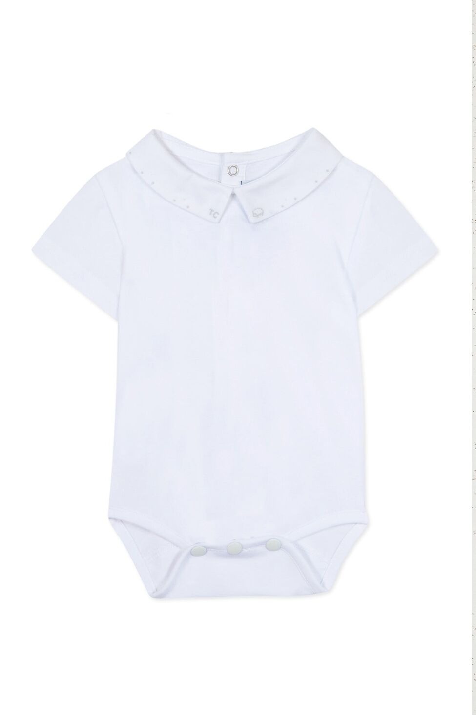 Невозможно не влюбиться в это великолепное боди белого цвета с остроконечным воротничком, которое сделает малыша таким же элегантным, как и взрослых во время церемонии. Для облегчения переодевания в промежности расположена система кнопок. Производство: ПОРТУГАЛИЯ