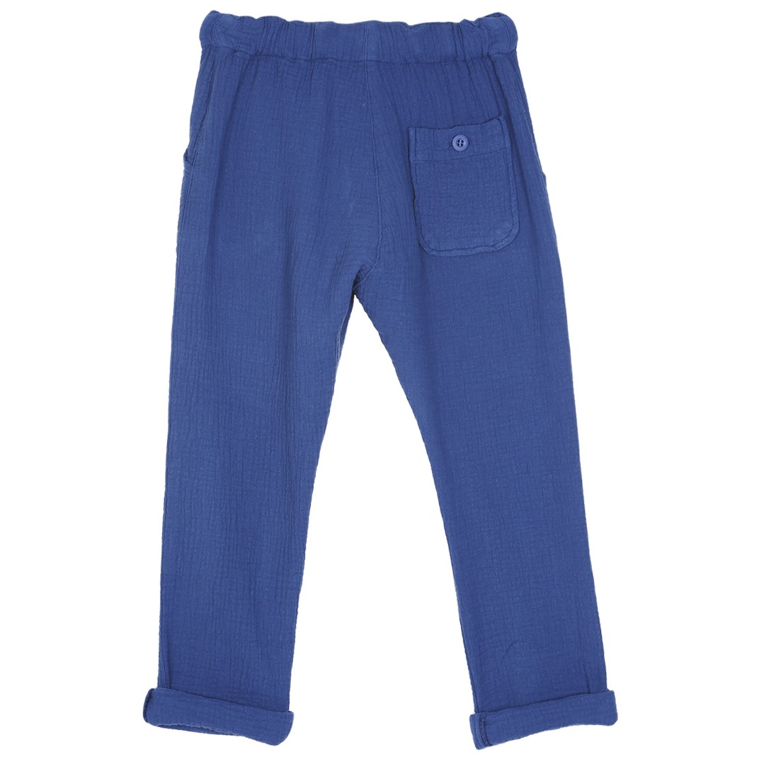 Брюки из хлопка синего цвета. Форма саруэля, мягкая струящаяся и не требующая особого ухода ткань, ширинка на пуговицах и регулируемый эластичный пояс с лентой из хлопкового твила в тон делают эти брюки базовыми в гардеробе. В дополнение к 2 накладным карманам спереди, у них также есть 1 накладной карман на пуговицах сзади.Производство: ПОРТУГАЛИЯ