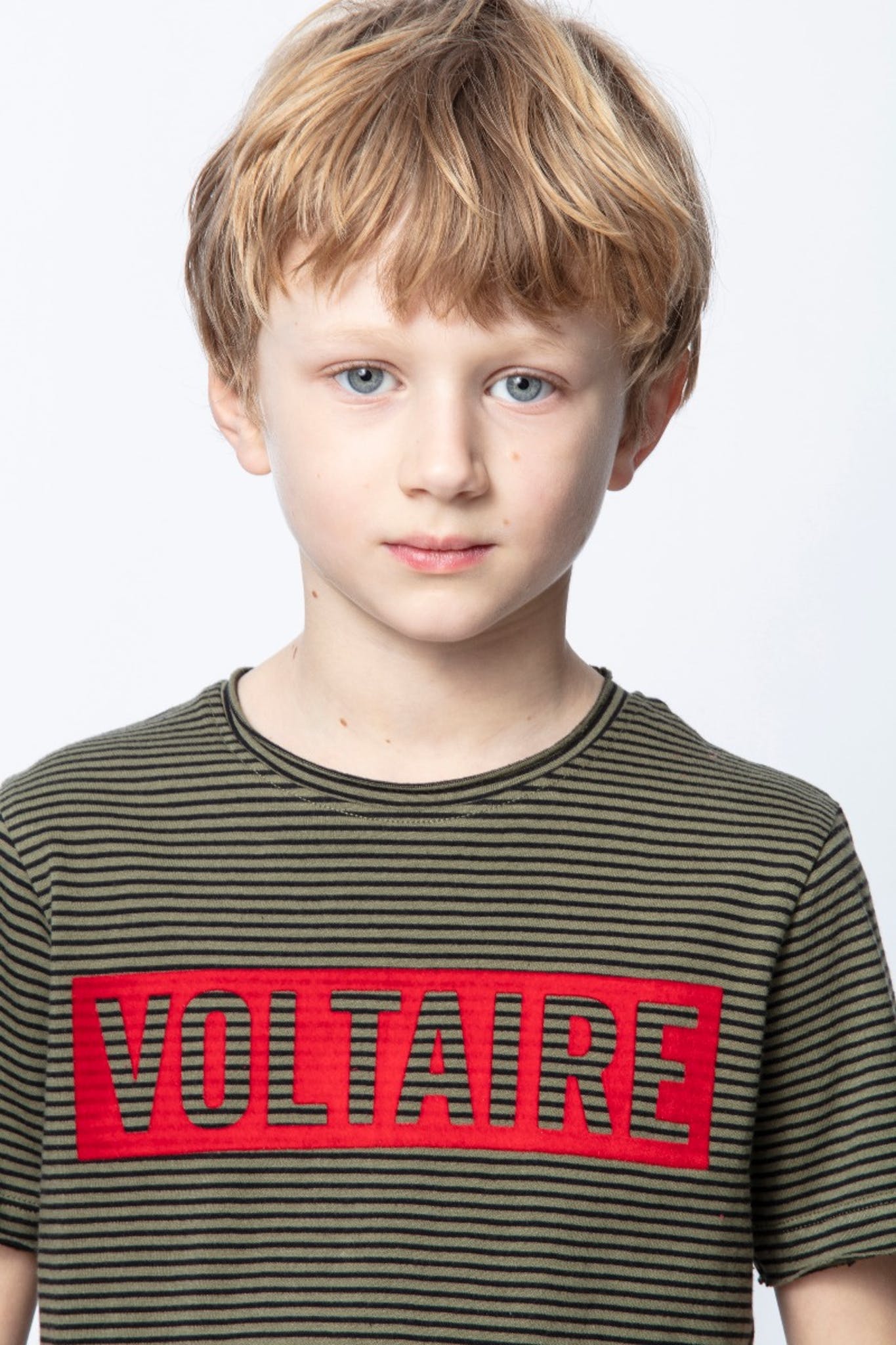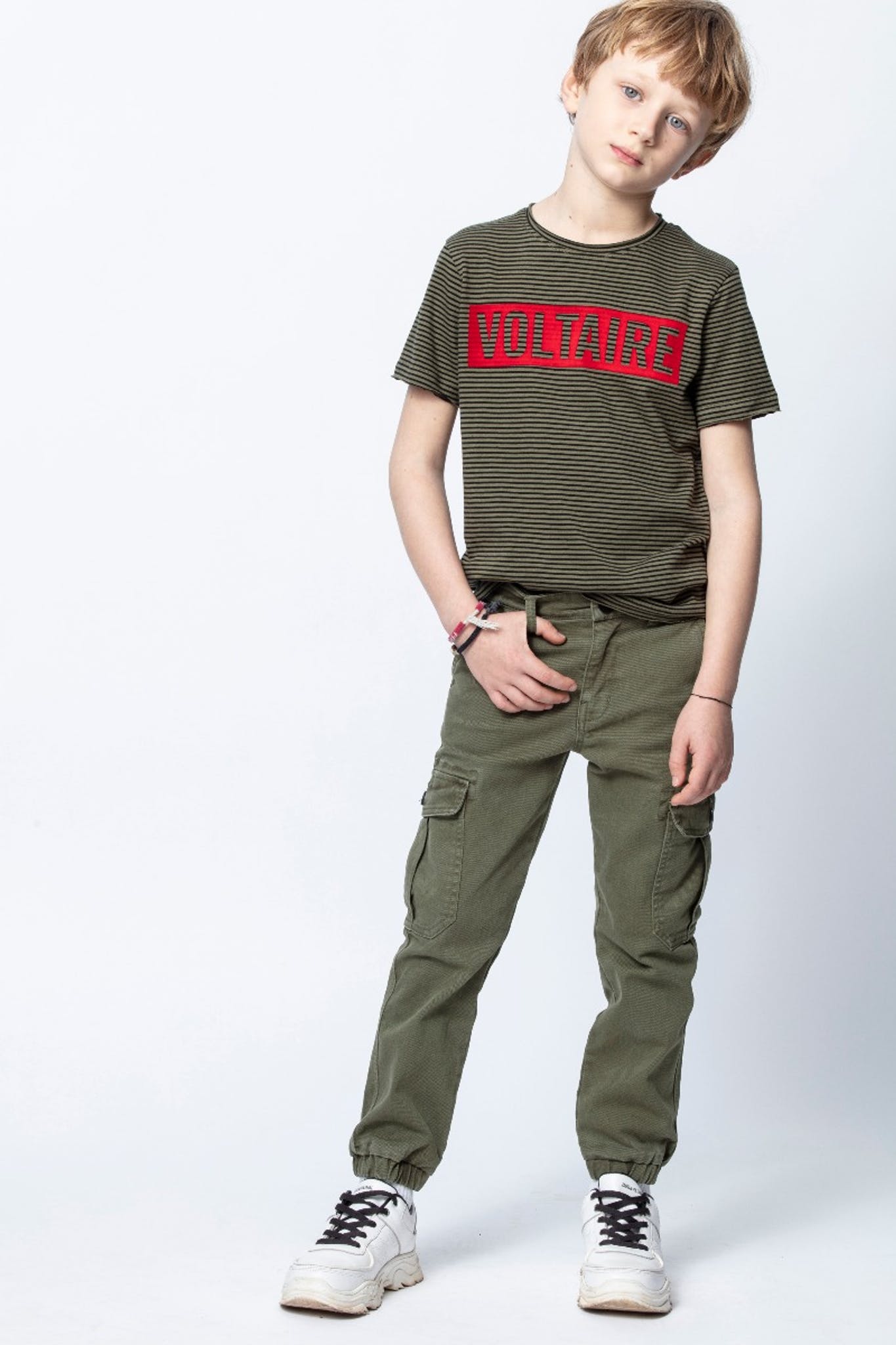 Футболка модного цвета хаки в черную полоску с ярким, контрастным текстовым брендированным принтом из натурального материала.
