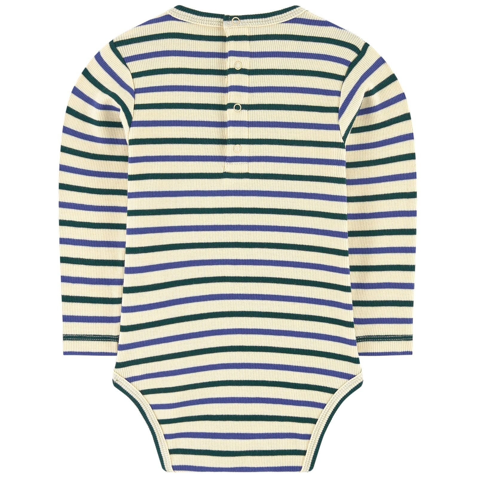 Это боди светлого кремового цвета с сине-зелеными полосками незаменимая вещь. Длинный рукав, натуральный состав делают эту модель максимально комфортной, а кнопки внизу максимально удобной.Производство: ПОРТУГАЛИЯ