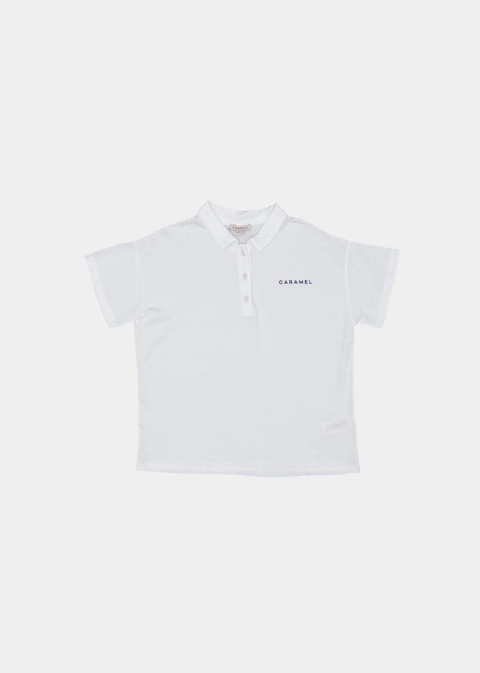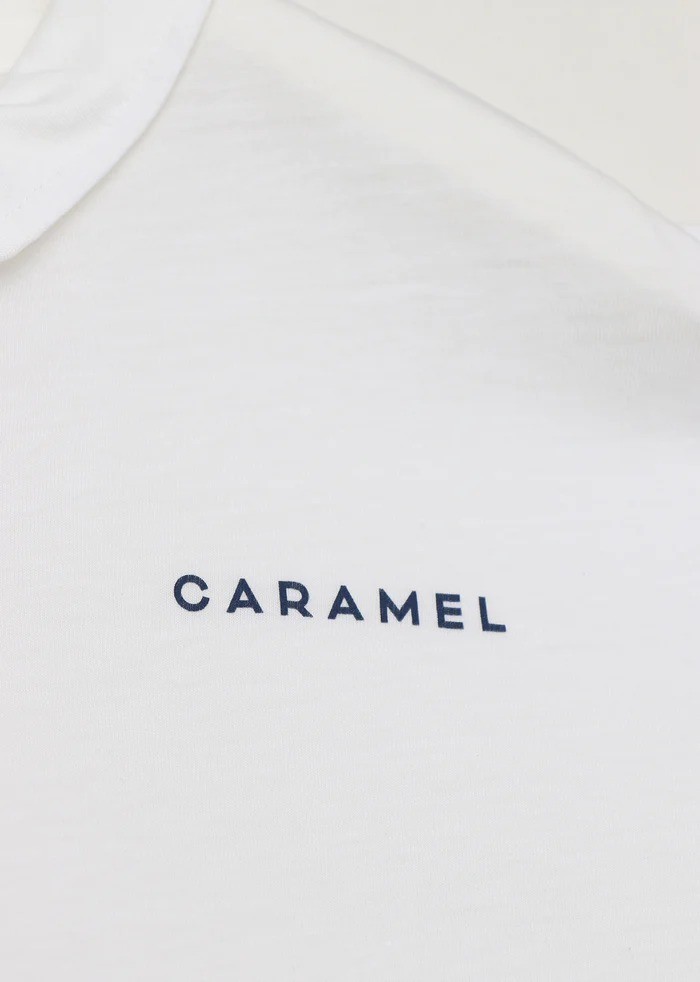 Практичная летняя одежда белоснежного цвета с логотипом Caramel. Изготовлено из смеси органического хлопка для дополнительной мягкости.