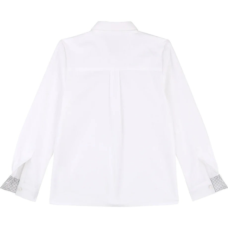 Нарядная белая рубашка в комплекте с синей бабочкой. Внутренняя часть манжета выполнена в дизайне синей клетке.Прекрасная вещь для любого праздника и церемонии.