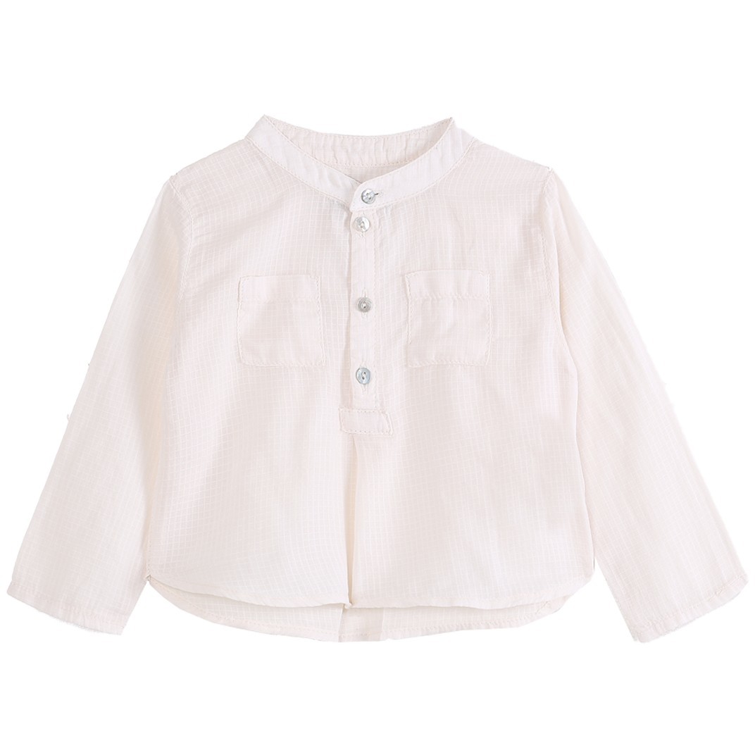 Нарядная рубашка цвета экрю с большими накладными карманами в мелкий рубчик, длинным рукавом, без воротничка, из 100% хлопка точно понравится Вашему малышу. Наденьте ее на праздничное мероприятие в саду и Ваш ребенок будет самым красивым и стильным.Производство: ПОРТУГАЛИЯ