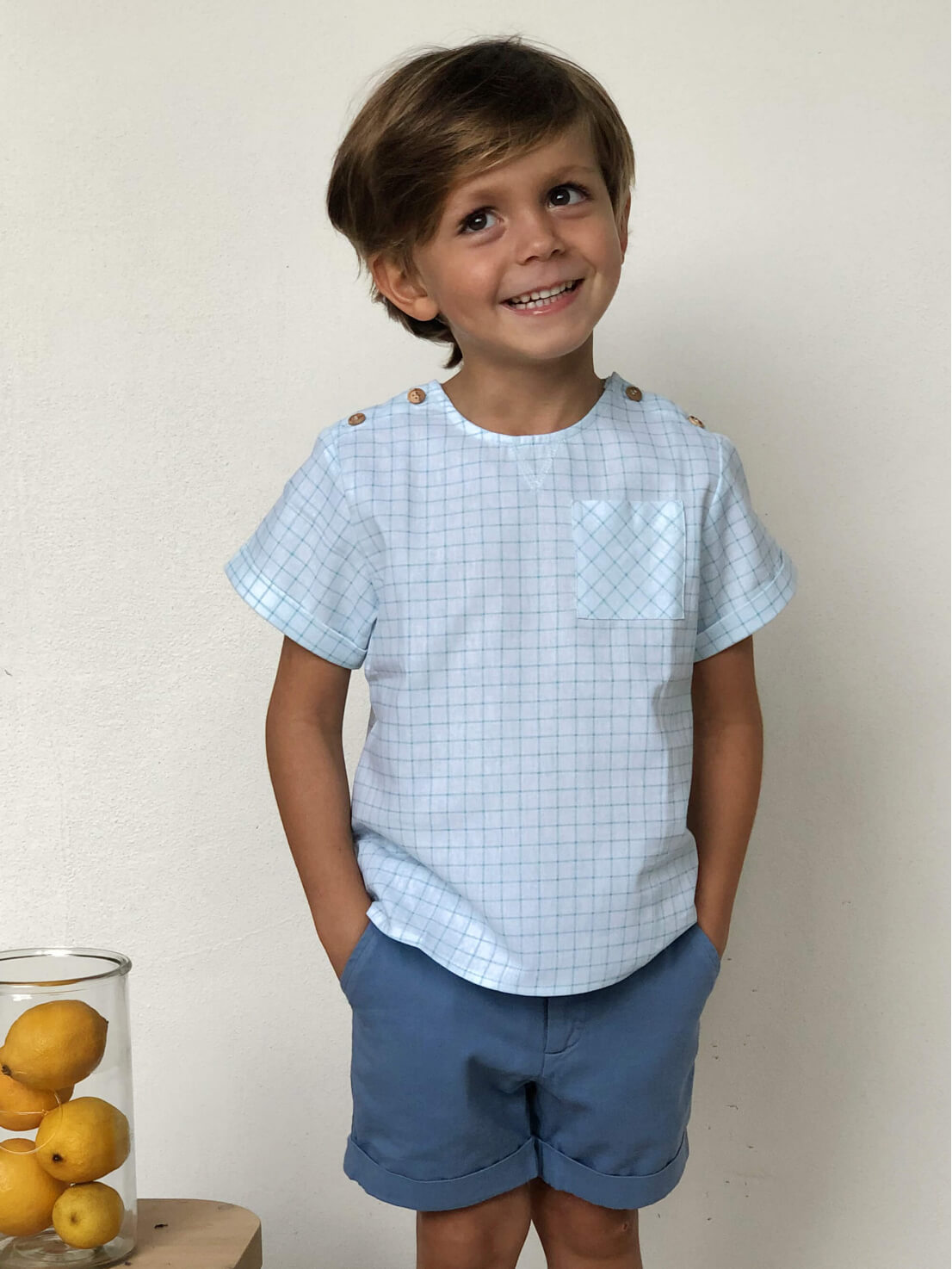 Эта рубашка в клеточку мятного цвета обязательно понравится Вашему малышу. Подходит для жарких летних дней. Изготовлена из мягкого хлопка, легко застегивается на пуговицы на плечах, маленький накладной карман, отвороты на рукавах.