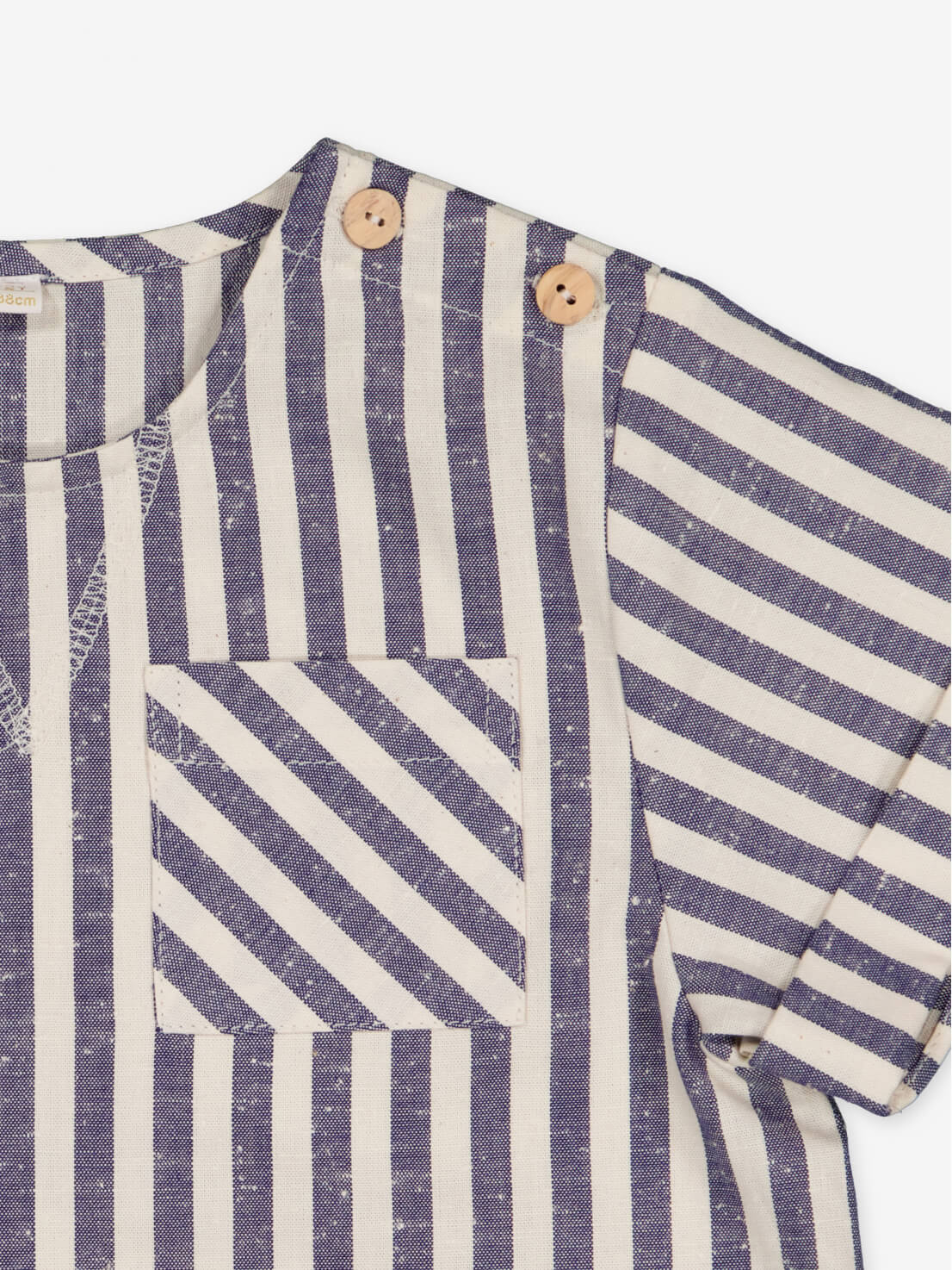 Эта рубашка в сине-белую полоску обязательно понравится Вашему малышу. Подходит для жарких летних дней. Изготовлена из мягкого хлопка, легко застегивается на пуговицы на плечах, маленький накладной карман, отвороты на рукавах.