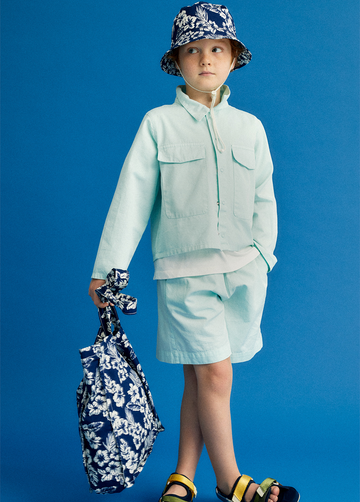 Шорты-бермуды из цветной, окрашенной в холодный голубой цвет хлопчатобумажной саржи, с деталью из толстой холщовой ленты, для дополнительной фиксации на талии, с боковыми карманами и одним накладным карманом сзади.