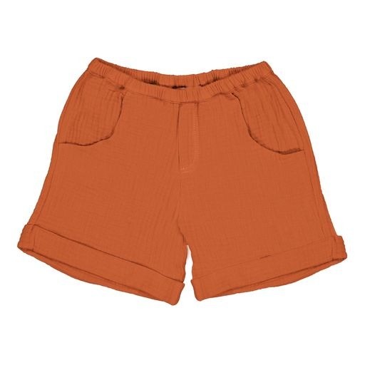Летние шорты из муслина подойдут и девочкам, и мальчикам. Эластичная резинка на поясе, карманы спереди, отвороты по низу изделия, цвет - терракотовый.