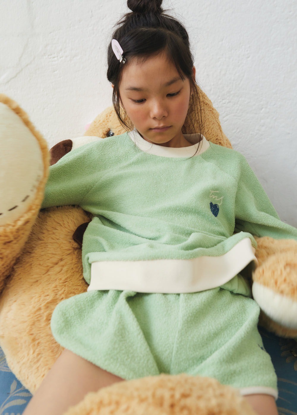 Свитер из хлопковой ткани BCI towel светло-зеленого цвета. Круглый вырез и длинный рукав, низ, манжеты и горловина в рубчик натурального цвета. С вышивкой спереди. Изготовлен в Португалии в одном из ателье бренда. Идеально сочетается с шортами в тон.Производство: ПОРТУГАЛИЯ