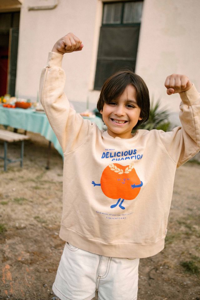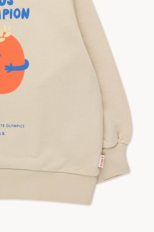 И золотая медаль достается... нашему восхитительному чемпиону! Победитель олимпиады Сочный Апельсин. Красочный принт на толстовке приятного ванильного цвета. Она имеет круглый вырез, длинные рукава с эластичной отделкой. Изготовлена из органического хлопка для максимального комфорта.Производство: ПОРТУГАЛИЯ