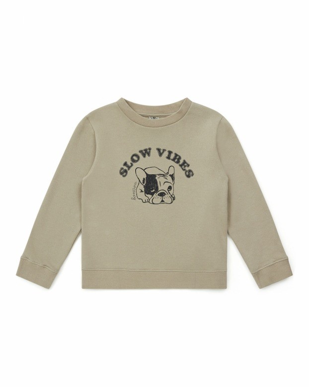 Свитшот цвета хаки изготовлен из флиса с забавным принтом маленького бульдога, идеально сочетается со спортивными брюками и джинсами. Модель унисекс.Уход: деликатная стирка при температуре 30 градусов, не отбеливать, стирать с аналогичными цветами.Производство: ПОРТУГАЛИЯ