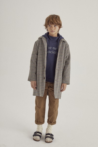 Пальто из фетровой шерсти с узором «гусиная лапка». Воротник, обычный рукав и разрез спереди на кукурузных пуговицах. Легкая подкладка для большего комфорта.